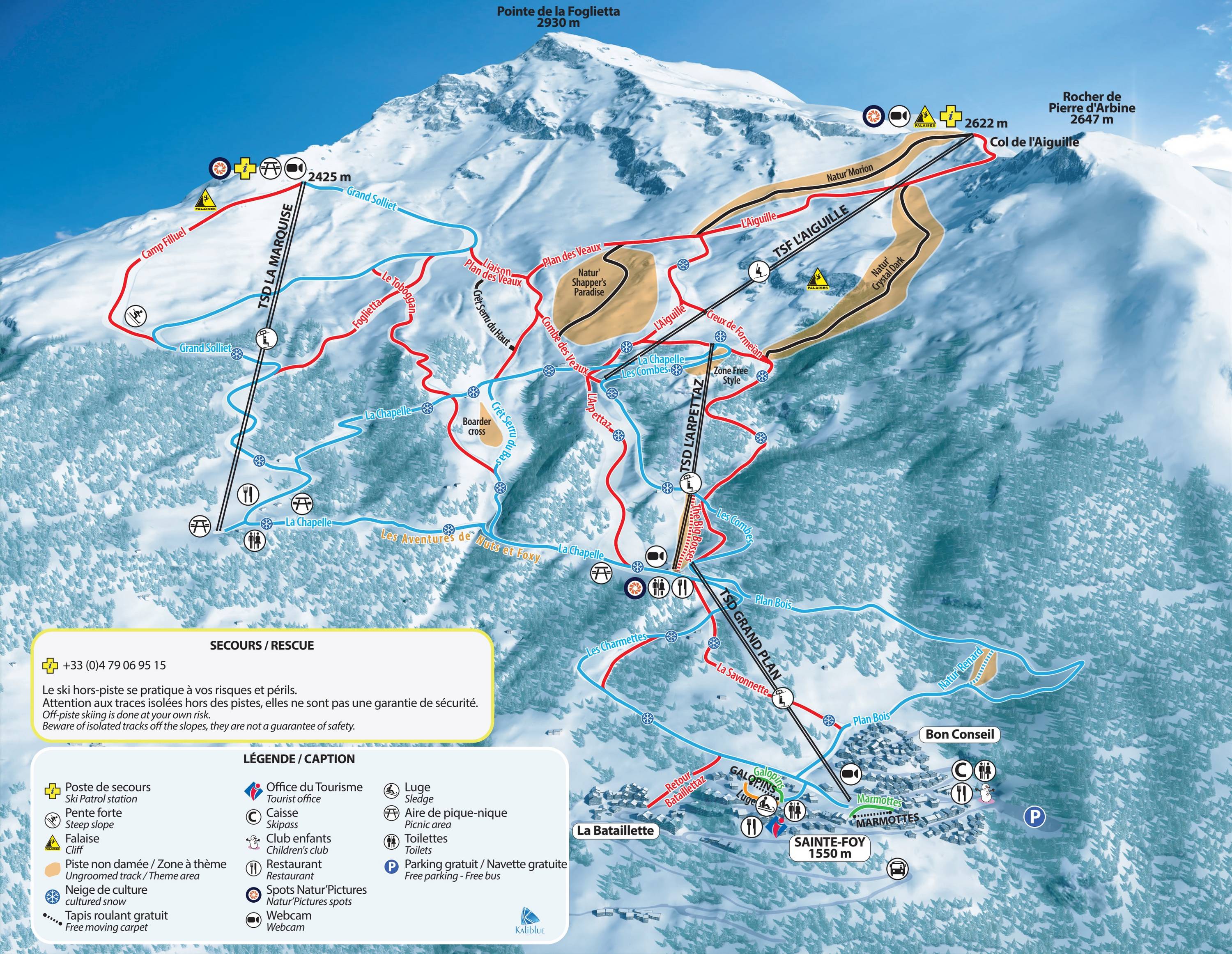 Az északnyugati fekvésnek köszönhetően a terep rendkívül hóbiztosnak számít. A pályák 1550 m-ről indulnak, itt van a sí-óvoda és egy szánkópálya. Feljebb már zöld pályát nem találunk, bár a hosszú Plan Bois nevű kék pálya a kezdők számára sem túl nehéz. A legmagasabb pont a gyönyörű kilátást nyújtó 2620 m-es Col de l'Aiguille ahonnan a piros pályák mellett a haladók nem ratrakolt fekete pályákon is lesíelhetnek. A terep másik szélén, a La Marquise felvonó tetejétől érdemes lecsúszni a fantasztikus panorámával rendelkező kék Grand Soilet pályán. Aki nem szereti a húzós felvonókat, az itt igazán jól érezheti magát, ugyanis mind a négy felvonó ülős.