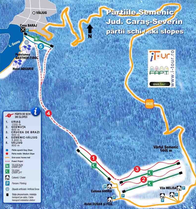 Az "ősrégi" Semenic és az új Valiug pályák egy 5,6 km hosszú erdei úton vannak összekötve, illetve a kettő között közlekedik az ország első síbusza. A pályák reggel 9.00 és délután 17.00 óra között tartanak nyitva.