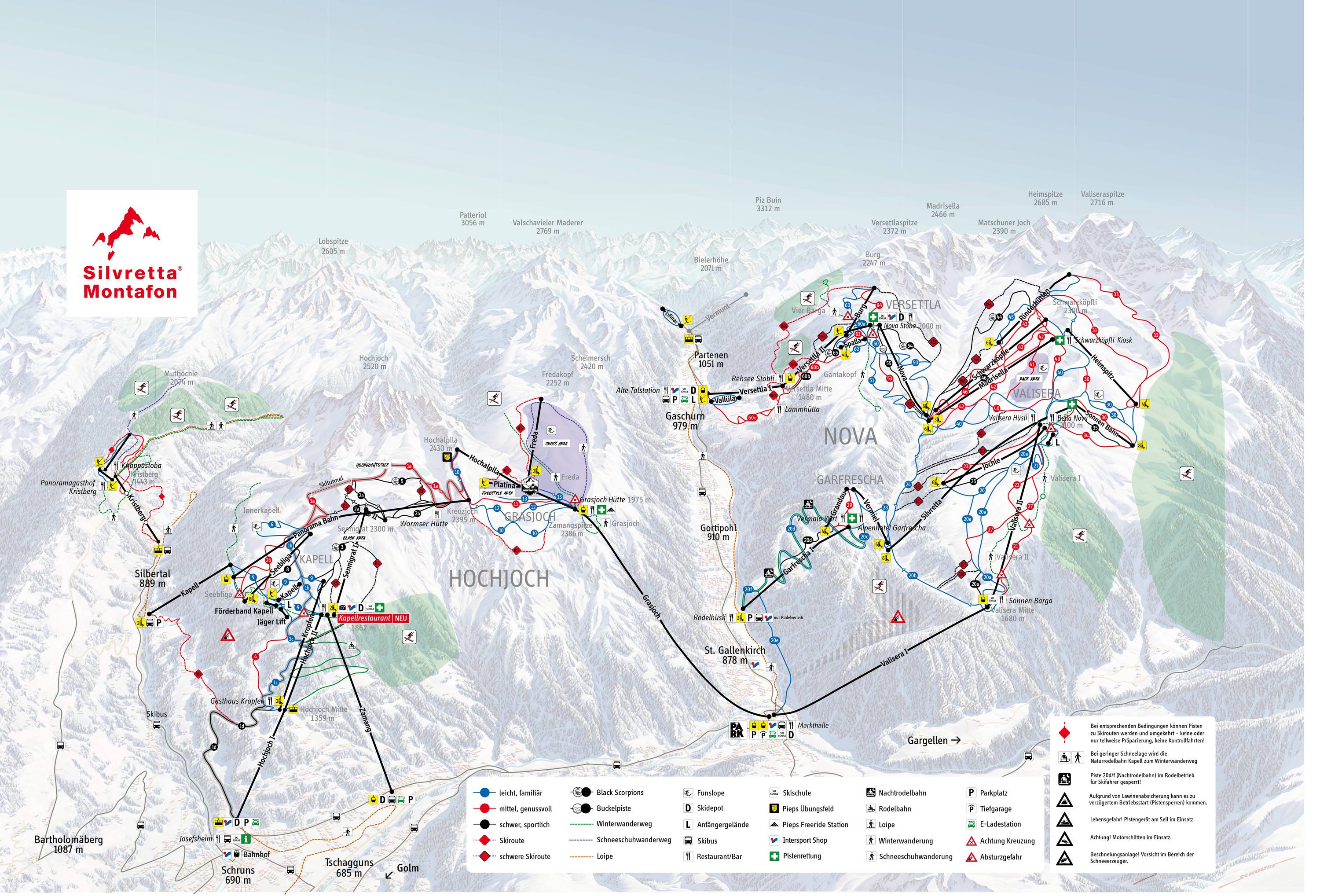 Silvretta Nova pályarendszeréhez több helyről is becsatlakozhatunk; St. Gallenkirchtől induló hatszemélyes kabinossal, vagy a Gaschurnból induló szintén hatszemélyes kabinossal, ami két szekcióban jut fel. Sízőket egy időmérővel ellátott óriás műlesiklópálya várja, ahol letesztelhetjük mennyire vagyunk gyorsak. Szintén van egy időmérővel ellátott carving pálya. De feltétlenül próbáljuk ki a 14 km hosszúságú Schwarzköpfle-Valisera pályát, amely a Montafon régióban a leghosszabbnak számít.
