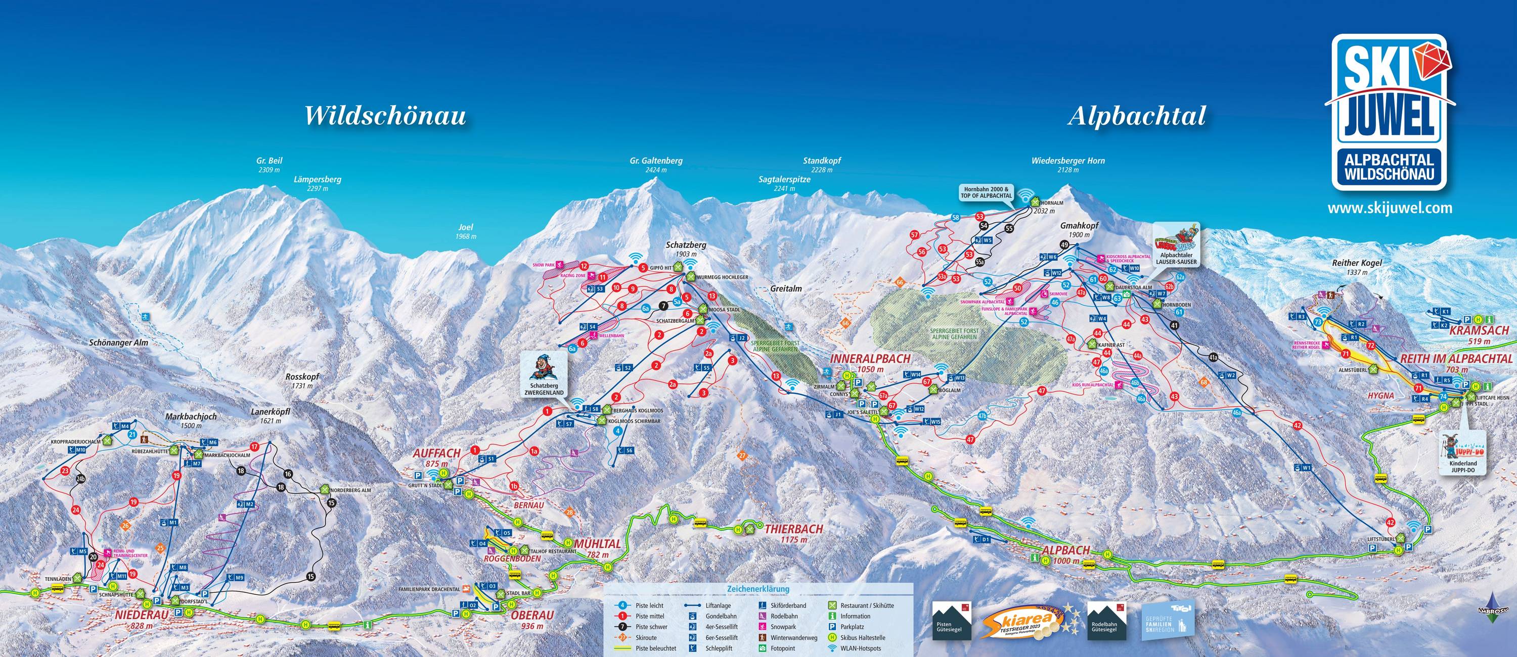 A síterep Salzburg irányából Innsbruck felé tartva az A12-es sztrádáról néhány perc alatt megközelíthető, szerpentinek nélkül. Inneralpbach településen egy 8 személyes kabinos lift visz a Schatzberg csúcsra, ahonnan egy 2 km-es pályán juthatunk vissza a középállomásig, ezzel biztosítva az összeköttetést a két nagy hegy között. A Gmahkopf csúcsra a Pöglbahnnal juthatunk fel, ahonnan változatos pályákon csúszhatunk le. A pályák 80%-át hóágyúzzák. A pályák változatosak, a leghosszabb, a "Schatzbergabfahrt" 7 km hosszú, felvonói modernek. A merészebbeket csodás freeride részek várják. A síterep legmagasabb pontjáról, a Hornlift 2000 m-es tetejéről csodás panoráma tárul a környező hegyekre.