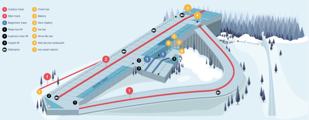 A beltéri részen két pályát és egy snowparkot építettek. A park leginkább a deszkásoknak készült. A két belső pálya közül a tanulópálya 30 méter széles és 150 méter hosszú, míg a nagypálya 460 méter hosszú lesz, 66 méteres „szintkülönbséggel”. Ehhez jön még a kültéri pálya, amely 640 méter hosszban használható +5 fokos hőmérséklet alatt.