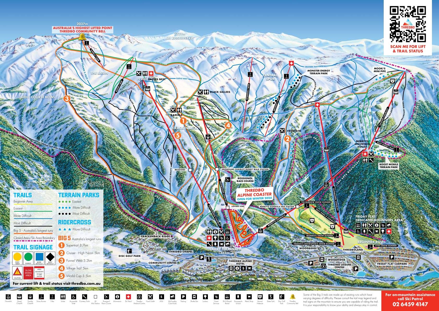Ausztrália legjobb síterepének választották a 2025-ös World Ski Awards szavazáson Thredbo-t. Itt a leghosszabb pálya hat kilométer. Van egy funpark boardercross pályával, korlátokkal és ugratókkal. Lehetőség van éjszakai sízésre, minden csütörtökön és szombaton a Friday Flat nevű pályán. Az esti sízés ingyenes!