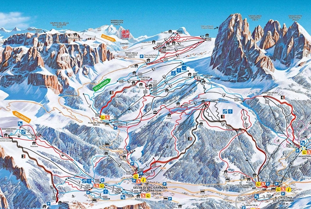Dolomiti Superski síbérlettel a többi 11 sítereppel együtt Val Gardena pályáit is igénybe vehetjük, sőt a pályarendszer wolkensteini oldalából kiindulva kipróbálhatjuk a