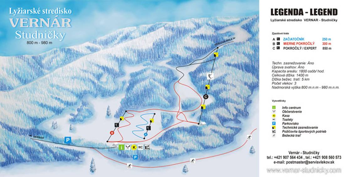 A sípályák elsősorban kezdőknek ajánlottak, viszont a terep legnagyobb, 180 m-es szintkülönbségű pályája a haladók igényeit is kielégíti. A tányéros felvonók közül a leghosszabb 700 méteres. A sípályák mellett őrzött parkoló, büfé, és síszerviz is található. A sípályákat viszonylag alacsony tengerszint feletti magasságuk ellenére, északkeleti fekvésüknek köszönhetően évente átlagosan 90 napon keresztül borítja síelésre alkalmas hótakaró. Étterem és szálláslehetőség Vernárban és Poprádon található a legközelebb.