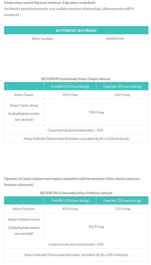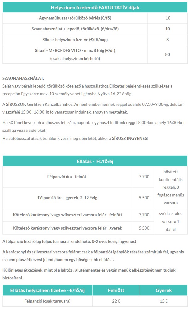 Ellátás: Önellátás vagy félpanzió igényelhető a központi étteremben. Önkiszolgáló étkezés (bővített kontinentális reggeli és 3 fogásos menüs vacsora). Ellátás önkiszolgáló módon, menüs rendszerben: reggeli 07:00–09:00-ig, vacsora 17:00–19:00-ig.