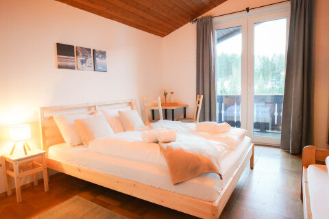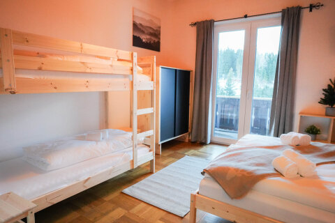 Nagy apartman akár 12 fő részére! Tágas konyha-nappali étkezőasztallal és székekkel, valamint 4 hálószobával (2db francia + emeletes ágyas hálószoba | 2 db franciaágyas hálószoba). Felszereltség: zuhanyzó, TV, ruhásszekrény, kisasztal, ágynemű, sampon, hajszárító, Wi-Fi.