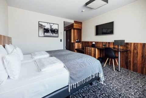 Elegáns, otthonos és világos szoba franciaággyal és igény esetén pótágyazási lehetőséggel.