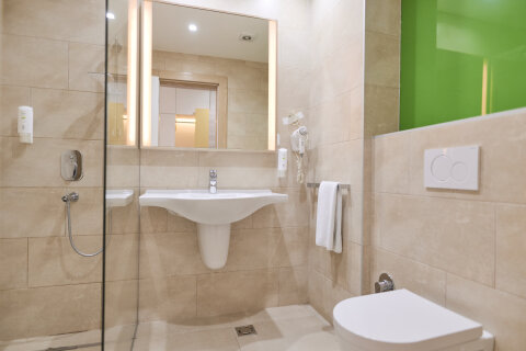 Tágas szoba három különálló ággyal (90x200 cm), vagy king-size franciaággyal (190x200 cm) + 1 különálló ággyal, zuhanyzós és WC-s fürdőszobával, valamint panorámás balkonnal.