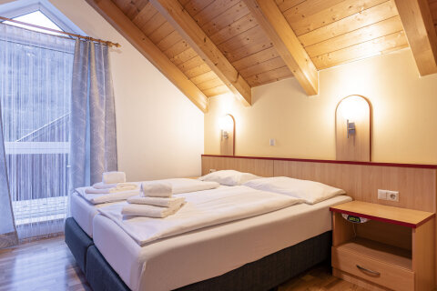 2 hálószoba, egyikben egy franciaágy, a másikban 2 illetve 3 egyszemélyes ágy található, amelyek a középső és a felső emeleten helyezkednek el. Kádas fürdőszoba.