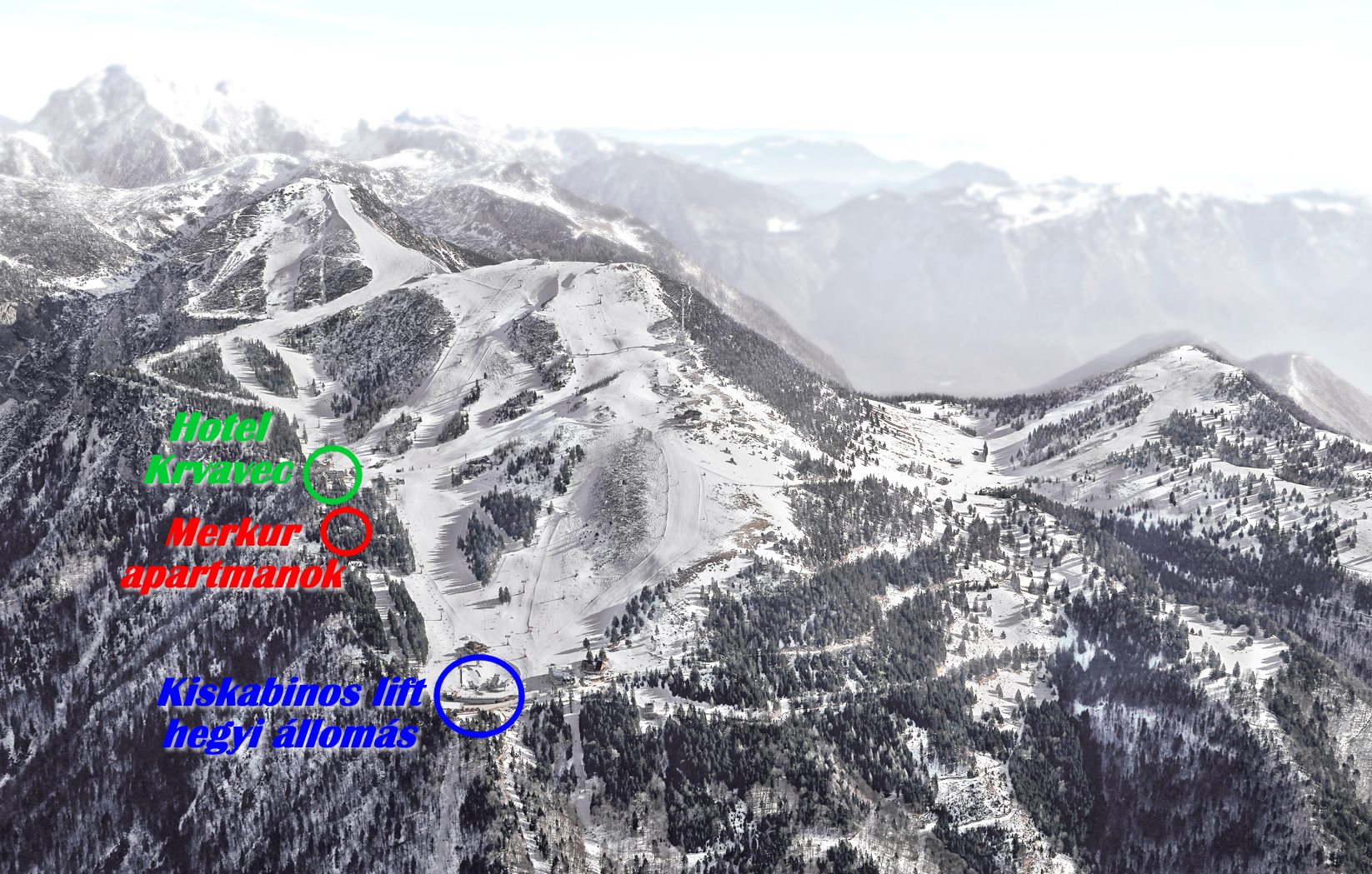 krvaveci sícentrum szívében, 1600 méteres magasságban található, három ülőlift