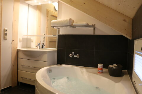 A földszinten egy kis wellness részleg található infrakabinnal és élményzuhannyal, míg a fenti szinten lévő fürdőszobában egy tusoló és pezsgőfürdős kád található.