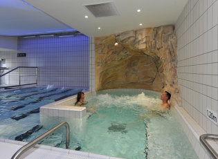 Az alsó szinten tágas szauna, gőzfürdő, kisebb melegvizes medence és jakuzzi várja a relaxálni vágyó síelőket. Belépéskor a recepción bérhető törölköző, papucs és fürdőköpeny. Ivóvíz és tea a wellness területén korlátlanul fogyasztható. További szolgáltatások, térítés ellenében: test- és arcmasszázs, aquabike, aquagym, azaz vízitorna.